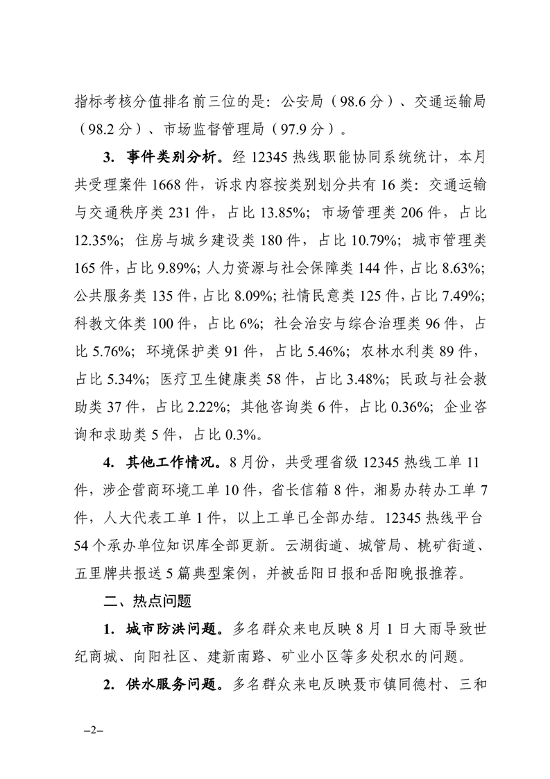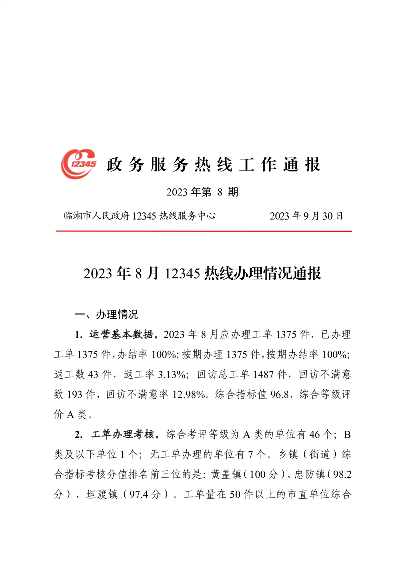 2023年8月12345熱線辦理情況通報
