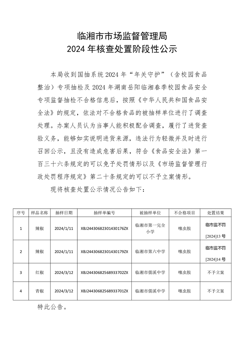 2024年臨湘市市場監督管理局核查處置階段性公示