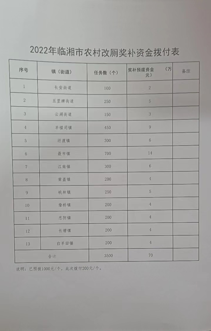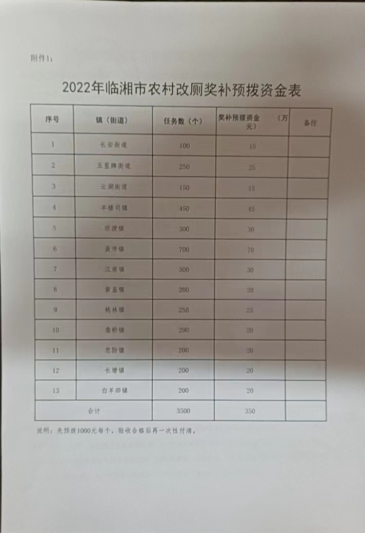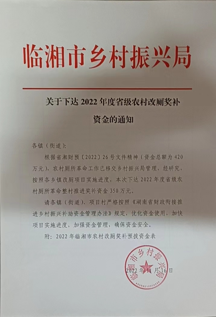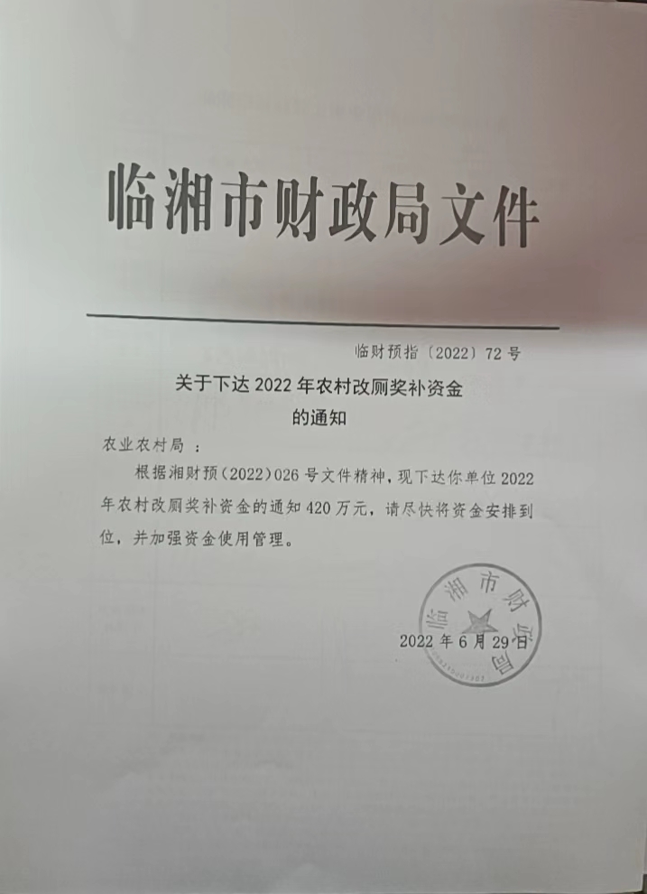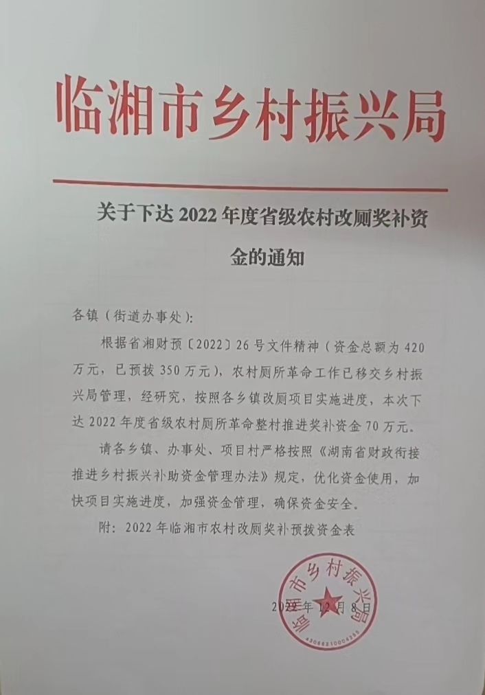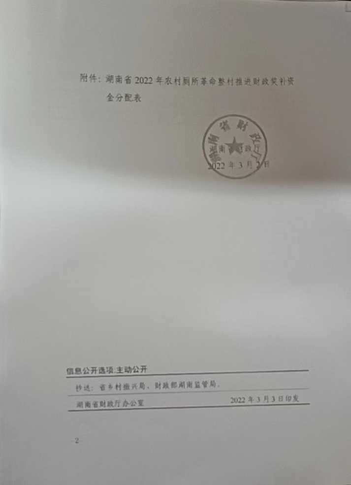 關(guān)于下達(dá)2022年農(nóng)村改廁獎(jiǎng)補(bǔ)資金的通知(湘財(cái)預(yù)[2022]26號(hào))