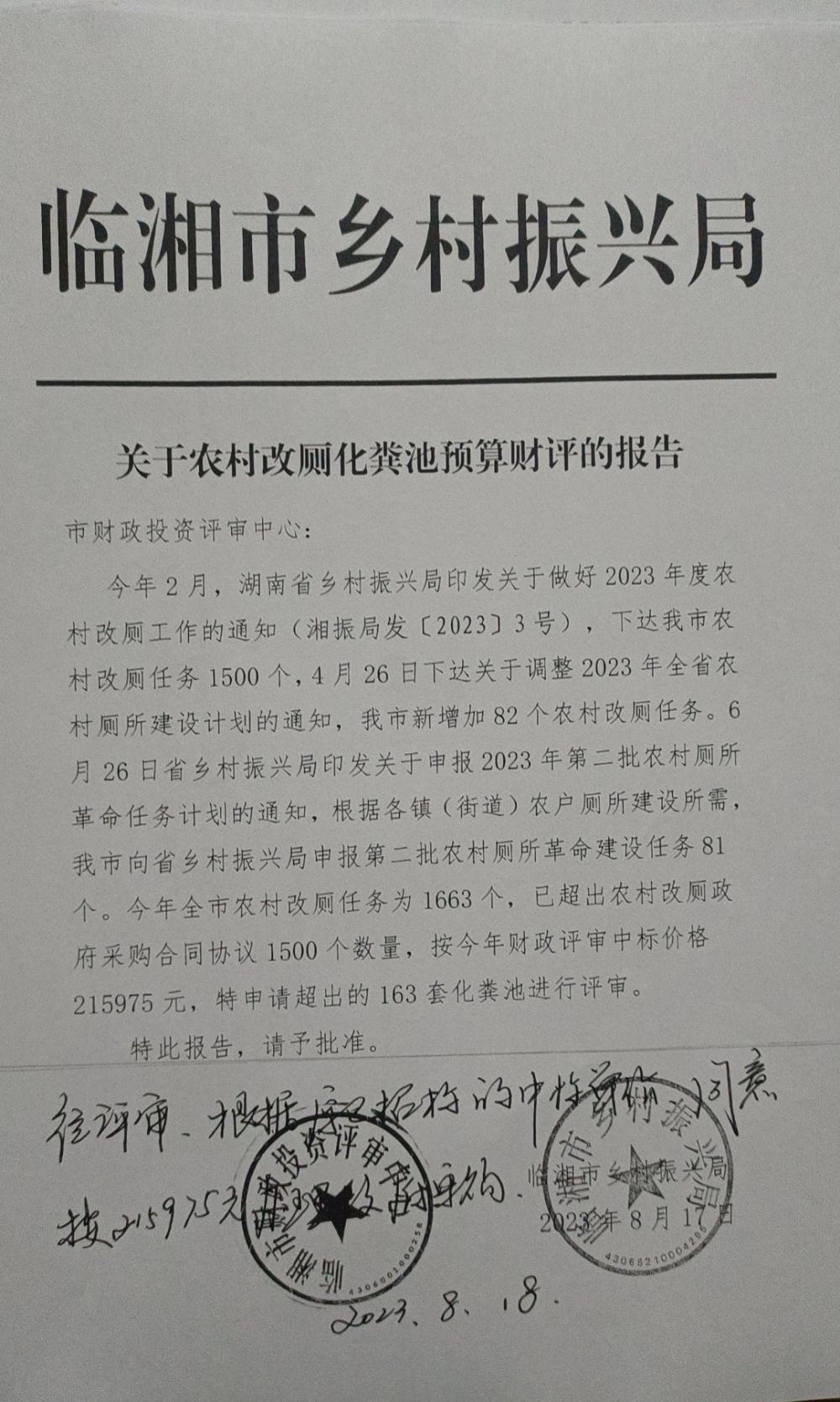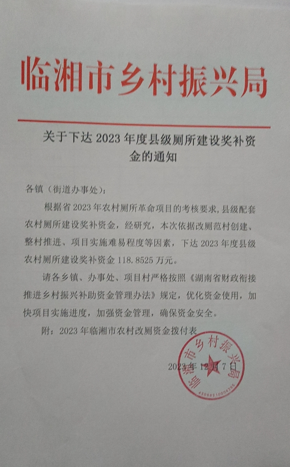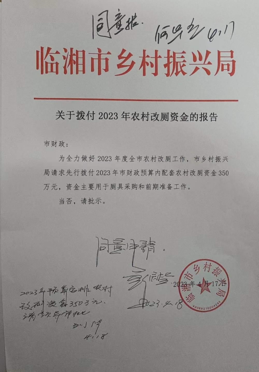 關(guān)于撥付2023年農(nóng)村改廁資金的報告