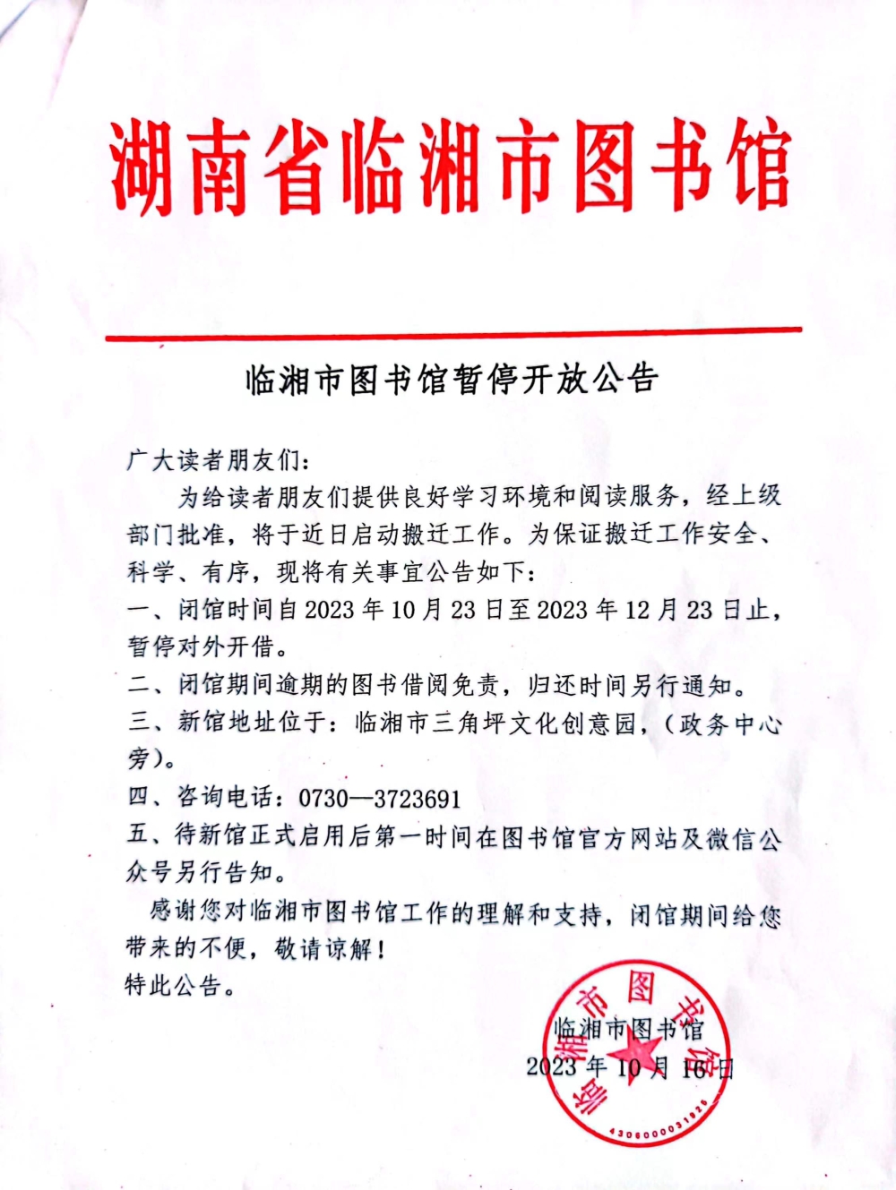 臨湘市圖書館暫停開放公告