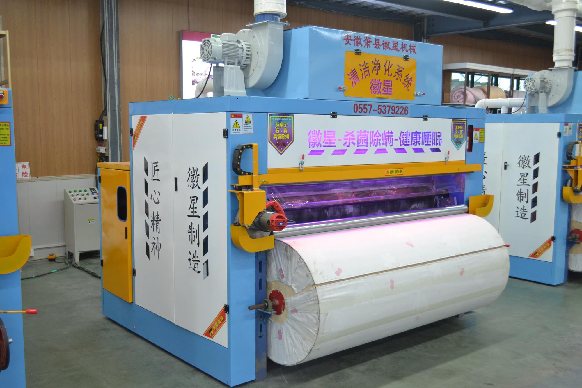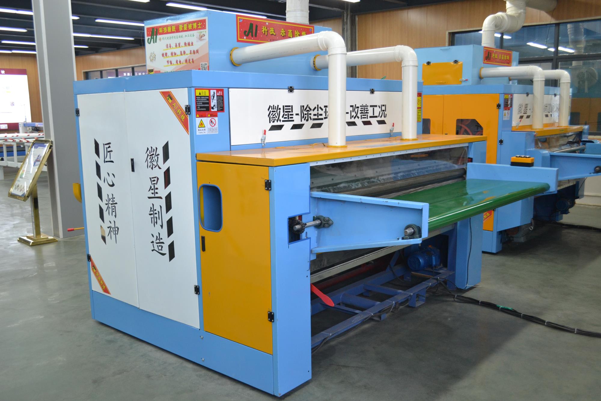 產(chǎn)品簡(jiǎn)介:彈花梳理一體機(jī)高配款,可對(duì)棉被寬度自由調(diào)節(jié),為對(duì)用戶的生產(chǎn)帶來了方便,大功率排風(fēng)機(jī),高效的吸除落棉、飛花和粉塵的裝置改善了勞動(dòng)環(huán)境減少了紗疵該機(jī)排雜性能良好。彈花梳理一體機(jī)高配款已向優(yōu)質(zhì)、高產(chǎn)、低耗的方向發(fā)展,機(jī)流程簡(jiǎn)單易學(xué),分體控制柜,按鍵一鍵啟動(dòng),雙側(cè)羅拉采用全封閉設(shè)計(jì),防纏繞,不塞棉,不藏灰,低噪音,錫林工作輥采用上市公司原材,該機(jī)可隔機(jī)安全觀察,開松四羅拉不抽花,雙雜亂。它配有雙吸塵系統(tǒng),除去棉花中的粉塵以及短絨,同時(shí)改善了工作環(huán)境。該機(jī)可對(duì)各種纖維、棉花、羊毛、駝絨、等原料開松梳理,是生產(chǎn)棉被、羊絨被、絲綿被的機(jī)械。